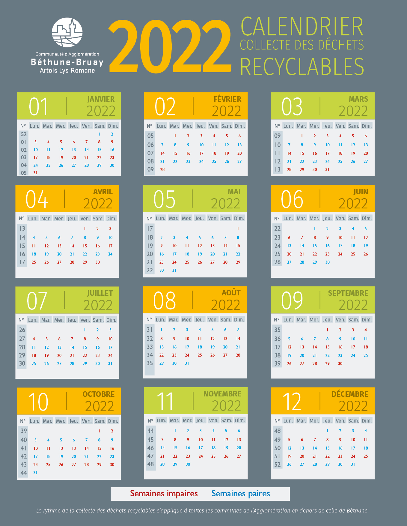 Vous trouverez ci-dessous le calendrier des semaines paires et impaires de cette année 2022... ou sur notre page collecte.