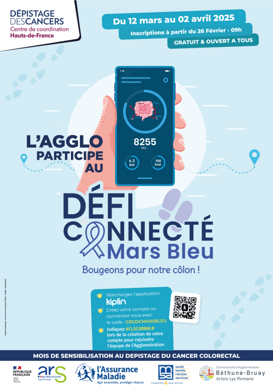 Du 12 mars au 2 avril 2025, vous êtes invité(e)s à relever un challenge via l’application Kiplin. Rejoignez le groupe de l'Agglo et informez-vous sur le dépistage organisé du cancer colorectal, dans le cadre de Mars bleu !