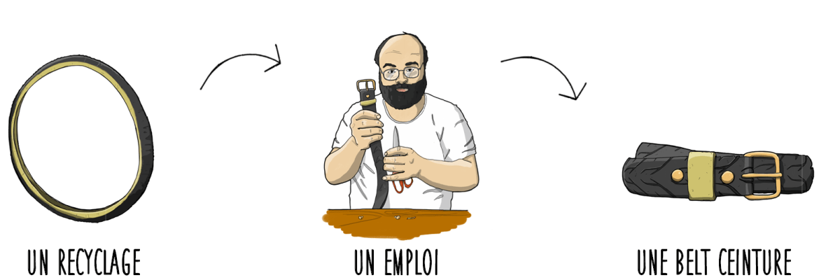 Une fois déposé dans le bac dédié au sein de votre déchetterie, votre pneu sera collecté par l'entreprise d'insertion de personnes en difficulté professionnelle "Main forte", puis livré dans les ateliers de l'entreprise AlterEos, qui emploie des personnes en situation de handicap et à qui La Vie est Belt confie la transformation des pneus en ceintures.