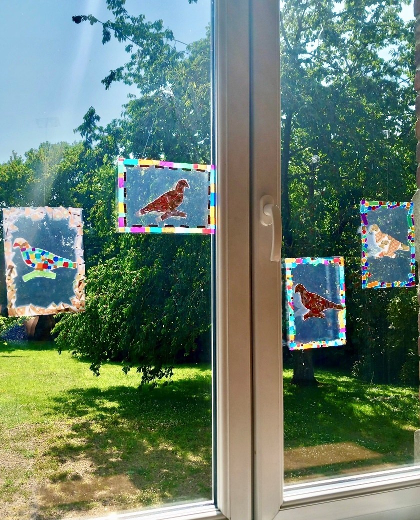 Après avoir découvert le banquet des pigeons de Lana Ruellan et la multitude d’oiseaux du ciel parsemé de nuages de Bastien Pourtout et Edouard Taufenbach, réalise l’oiseau de tes rêves en mosaïque de papier peint et tesselles colorées et transparentes. Crée ton mobile et suspends-le devant la fenêtre, afin de protéger les oiseaux du ciel des percussions contre les vitres.