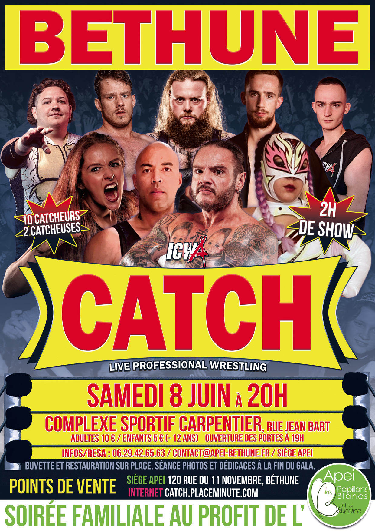 Le samedi 8 juin à 20h L’ICWA, fédération internationale de catch installera son ring à Béthune. L’occasion pour les petits et les grands de passer une soirée riche en émotion et de contribuer à l’amélioration des conditions de vie des personnes accompagnées par l’association les papillons blancs de Béthune. Les amateurs de sport, de sensations fortes et de prises ultra-spectaculaires n’auront aucunes excuses : le 8 juin c’est à Béthune qu’il faudra se retrouver ! Comme aime le rappeler Pierre Fontaine, responsable de l’ICWA : « le catch est un vrai sport pour celle et ceux qui le font et un vrai spectacle pour celles et ceux qui viennent y assister. N’hésitez pas, venez en famille, venez nombreux pour soutenir cette belle cause. Comme toujours dans le nord de la France l’ambiance va être magique ! » Les billets d’entrée sont en vente au siège de l’Apei de Béthune (120 rue du 11 novembre) et en ligne sur placeminute.com : https://www.placeminute.com/event/sports/gala-de-catch-action-solidaire-hexagone-3,43383.html Il sera également possible de prendre les billets sur place le soir du gala. *10 euros pour les adultes et 5 euros pour les enfants moins de 12 ans*