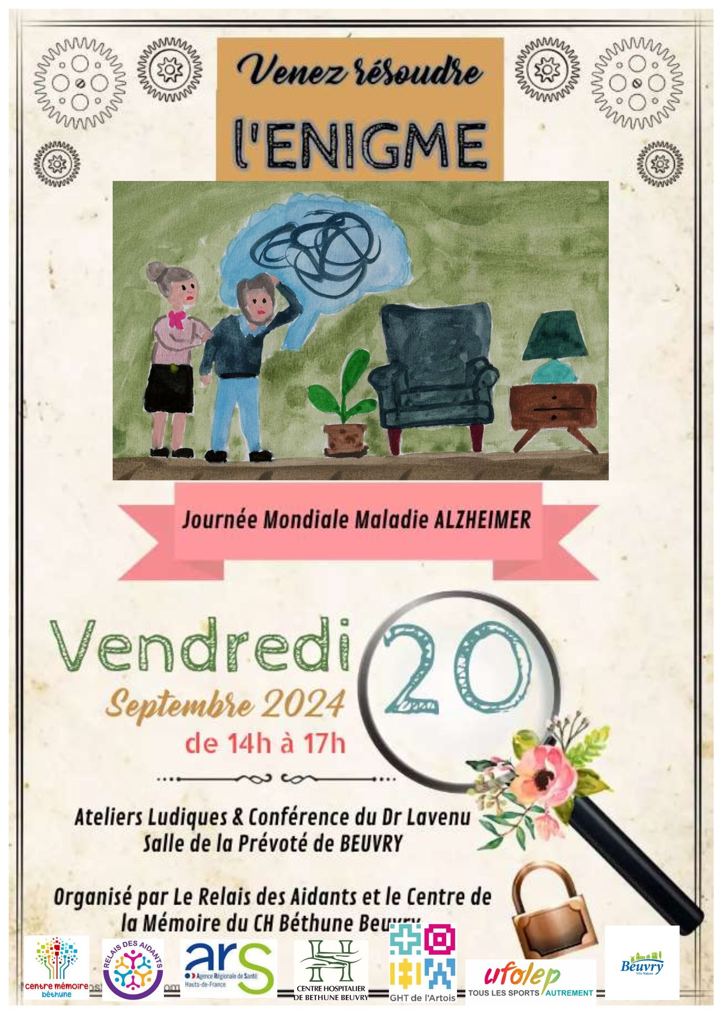 Le Centre de la Mémoire et le Relais des Aidants vous invitent à participer à leur journée organisée pour la Journée Mondiale Alzheimer . Venez nous aider à résoudre l'énigme :" Mais où sont passées mes clés ?" La journée sera clôturée par l'intervention du Dr Lavenu , neurologue , et de Me Laval Doucy , psychologue clinicienne, par une conférence .