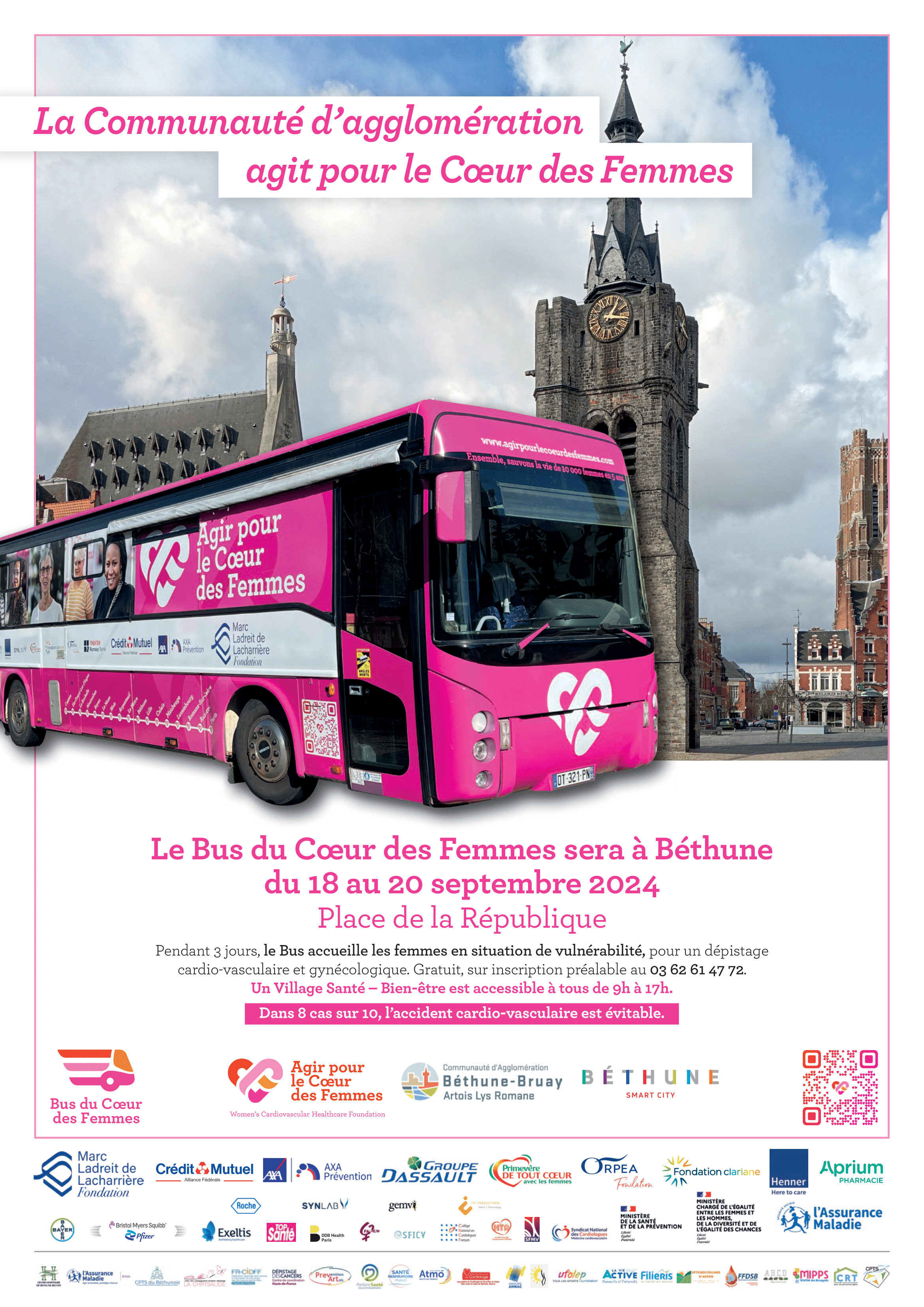 La Communauté d’agglomération agit pour le Coeur des Femmes adu 18 au 20 septembre 2024 avec la présence du Bus du Coeur des Femmes à Béthune.
