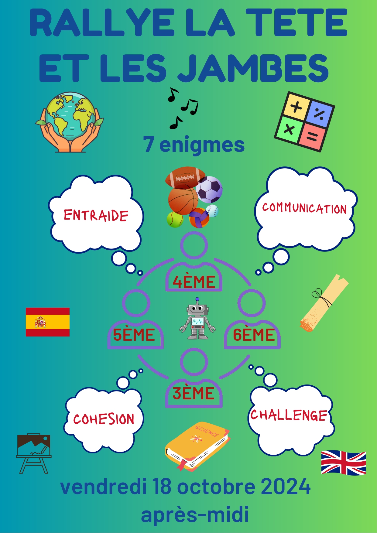 Le collège Saint-Vaast de Béthune organise le vendredi 18 octobre 2024 un rallye « La tête et les jambes ». Cet événement réunira les 600 élèves du collège dans 150 équipes chacune composée de 4 élèves. Une équipe type sera composée d’un 6ème, d’un 5ème, d’un 4ème et d’un 3ème. Chaque équipe devra passer par 7 pôles différents avec alternativement une énigme à résoudre dans les domaines des Mathématiques, Sciences, Arts & Littérature et Langues puis deux épreuves sportives à réaliser.