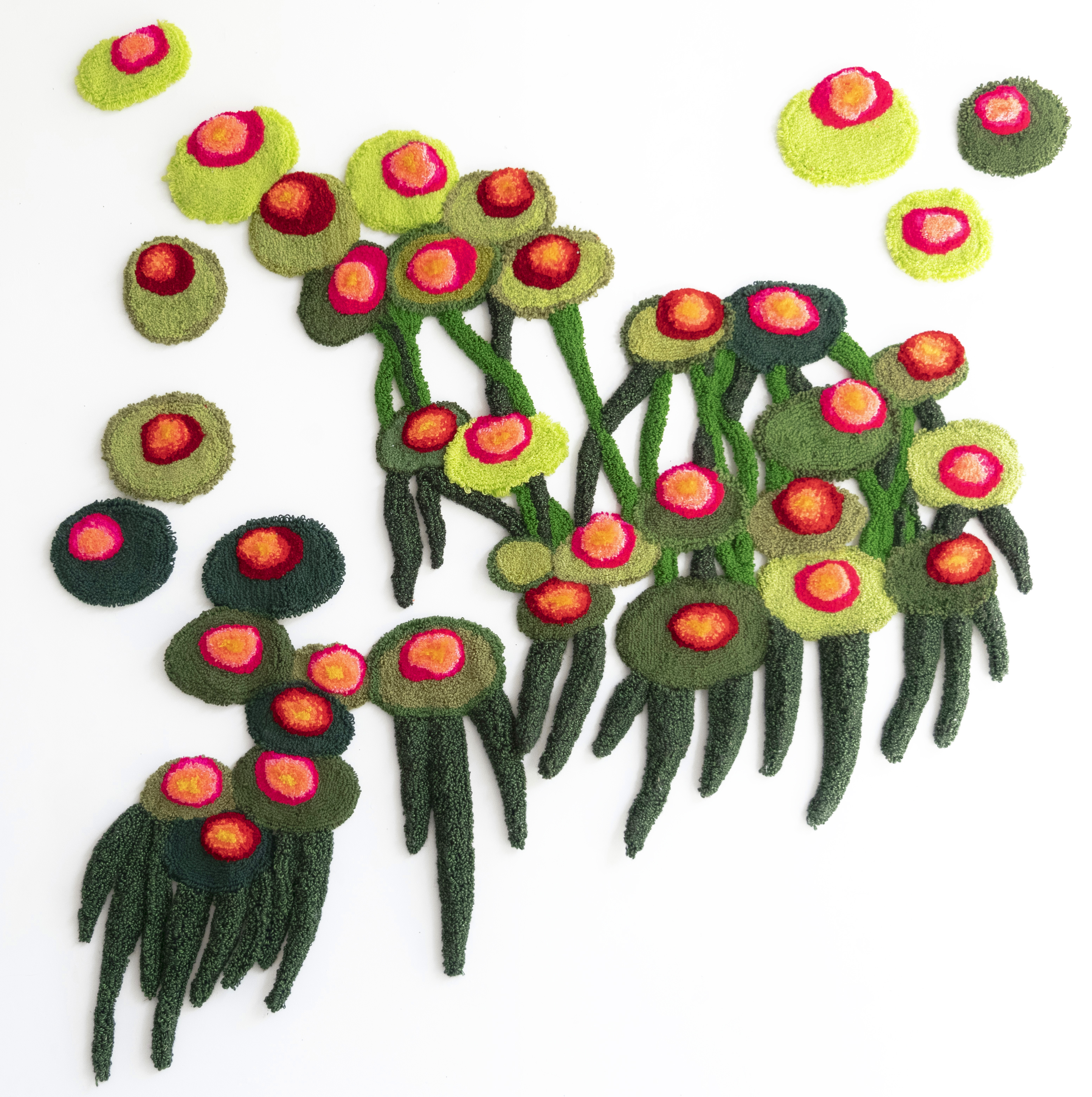 À la surface des amas de schistes sombres appelés « terrils », qui aurait pensé que se déploierait un jour un monde végétal aussi délicat que chatoyant ? Orchidées et œillets rivalisent de couleurs, et nécessitent que nous veillions à leur préservation. Par son installation constituée de grandes tapisseries en laine touffetée, Claude Como se fait l’écho de cette nature lumineuse. Une invitation à découvrir, émerveillé, la richesse insoupçonnée de la nature.