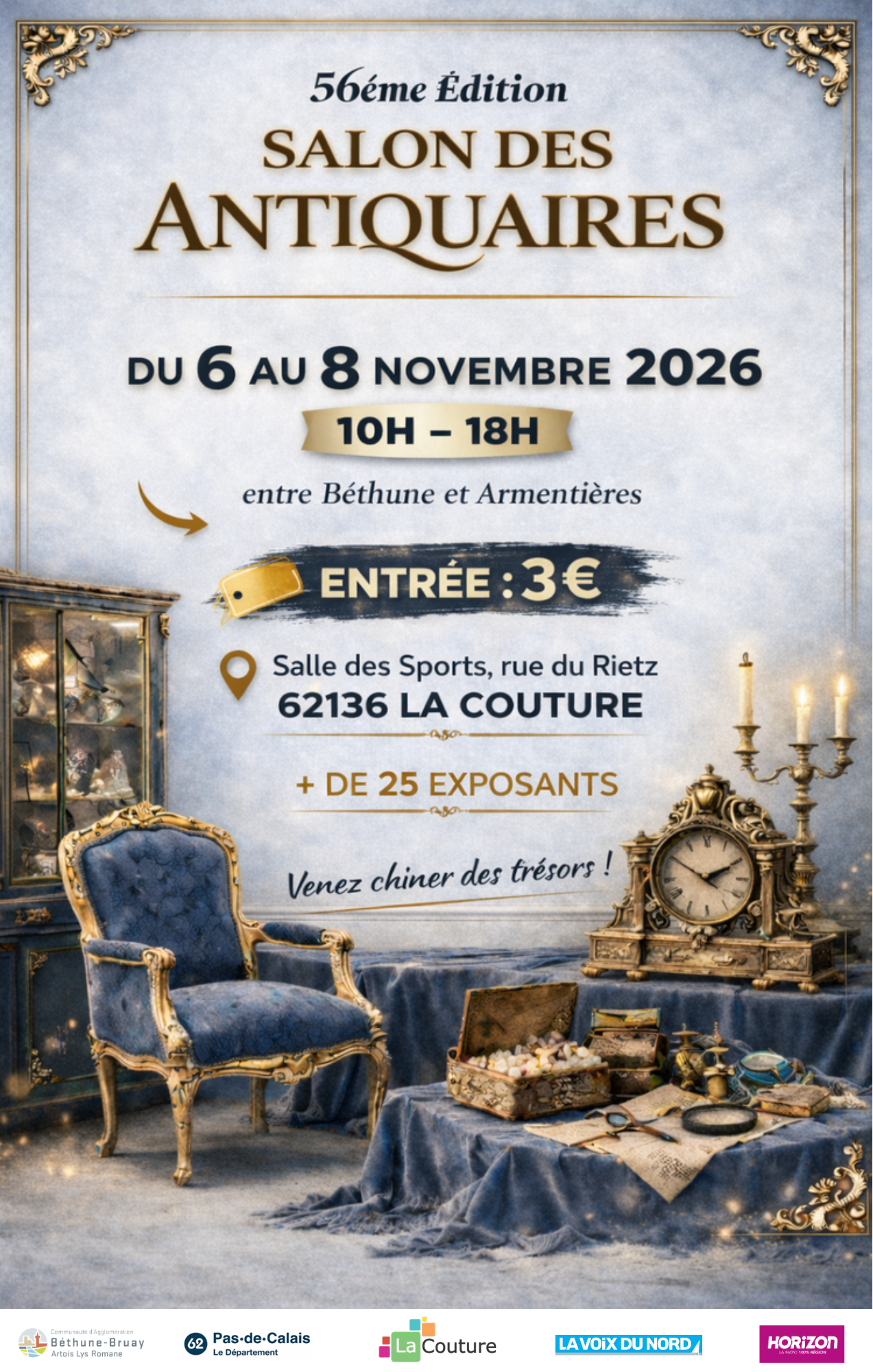 Du 06 Nov - 08 Nov Mairie de La Couture / La Couture 10h - 18h Événement Salon des antiquaires Salon des Antiquaires 2026 Ajouter au calendrier Public : Tout public Salle des Sports, rue du Rietz 62136 LA COUTURE Localiser Choice of plan Fermer Precedent Retour à la liste Suivant