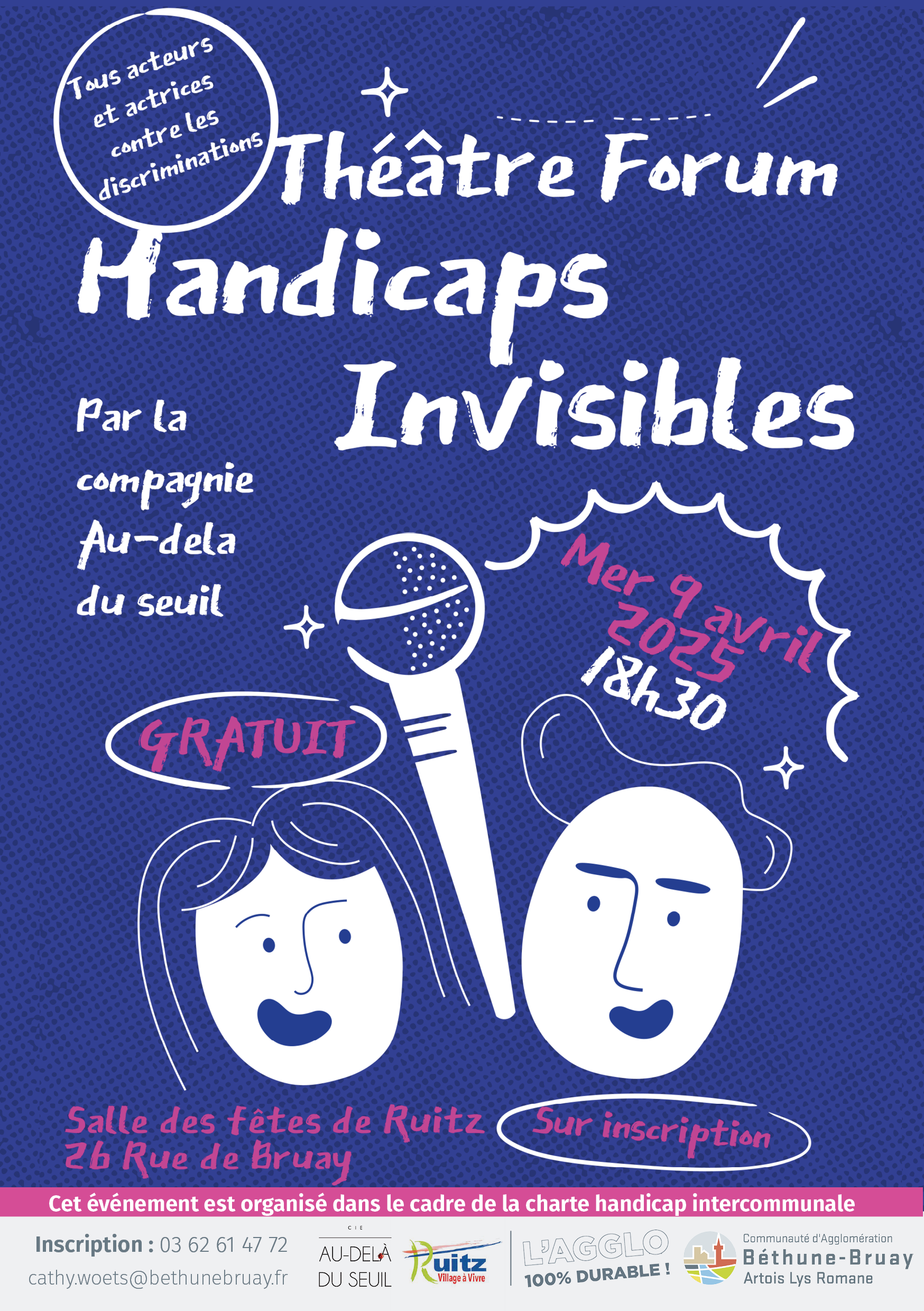 Retrouvez-les le 9 avril prochain à la salle des fête de Ruitz (26 rue de Bruay)dans le cadre de la charte handicap de l'Agglomération pour une soirée consacrée aux handicaps invisibles.