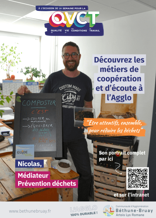 Nicolas occupe son poste en tant que fonctionnaire depuis son arrivée à l’Agglo de Béthune-Bruay en 2011 par voie de mutation. Après une licence Gestion des déchets, il a débuté sa carrière dans une communauté de commune de l’Aisne où il a exercé les fonctions d’ambassadeur du tri pendant 3 ans. En 2020, il a acquis le statut de « Maître composteur » suite à une formation complémentaire.