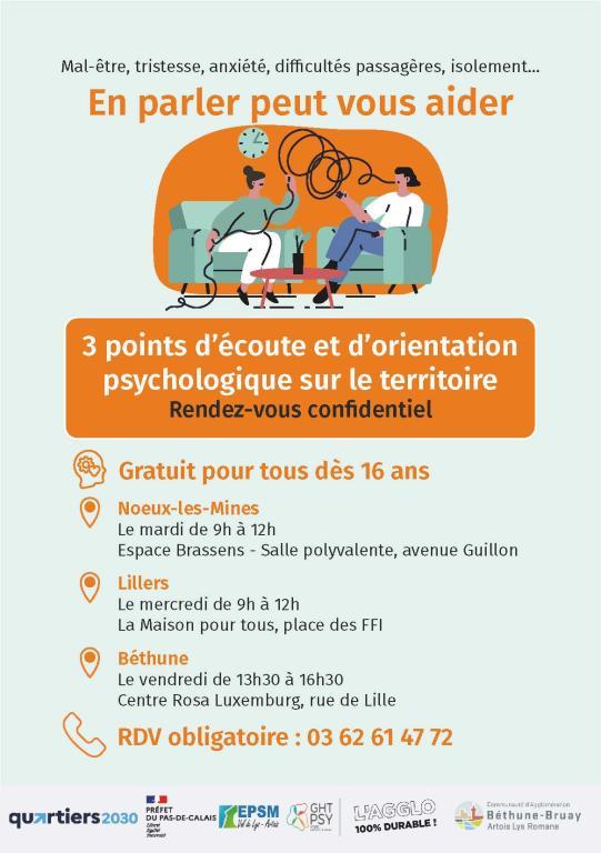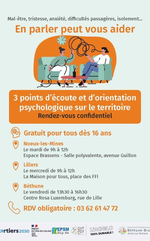 En cas de détresse psychologique, de mal-être, de difficultés personnelles ou familiales... Trois points d’écoute et d’orientation psychologique sont à votre disposition à Lillers, Béthune et depuis peu à Noeux-les-Mines.