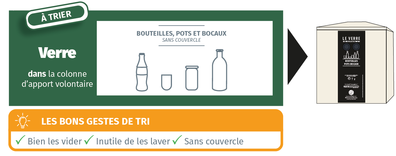 Attention : n’y jetez pas de verre non recyclable (ampoules, vaisselle et vitre cassée) ni de vase, de miroir ou de vaisselle en porcelaine (à mettre dans votre bac à couvercle foncé), et veillez à bien jeter vos verres DANS la colonne, ne posez pas vos bouteilles juste à côté !