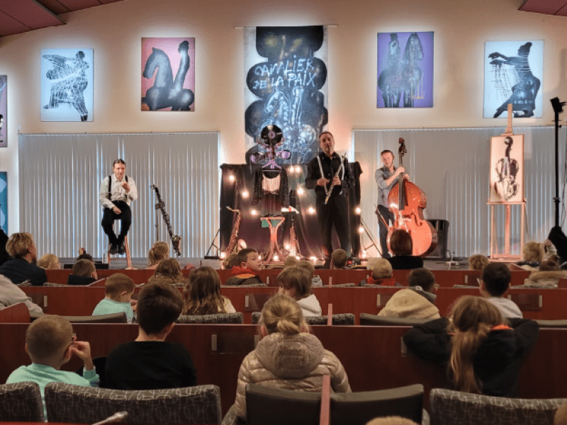 Une fois le mystère de sa disparition éclairci, les musiciens ont présenté les instruments au spectateurs. Puis l’inspecteur Miaou a poursuivi l’enquête avec le jeune public pour identifier les tableaux de Kijno évoquant la musique. Douze classes de maternelles et de primaires ont ainsi pu découvrir le jazz et le conte théâtralisé.