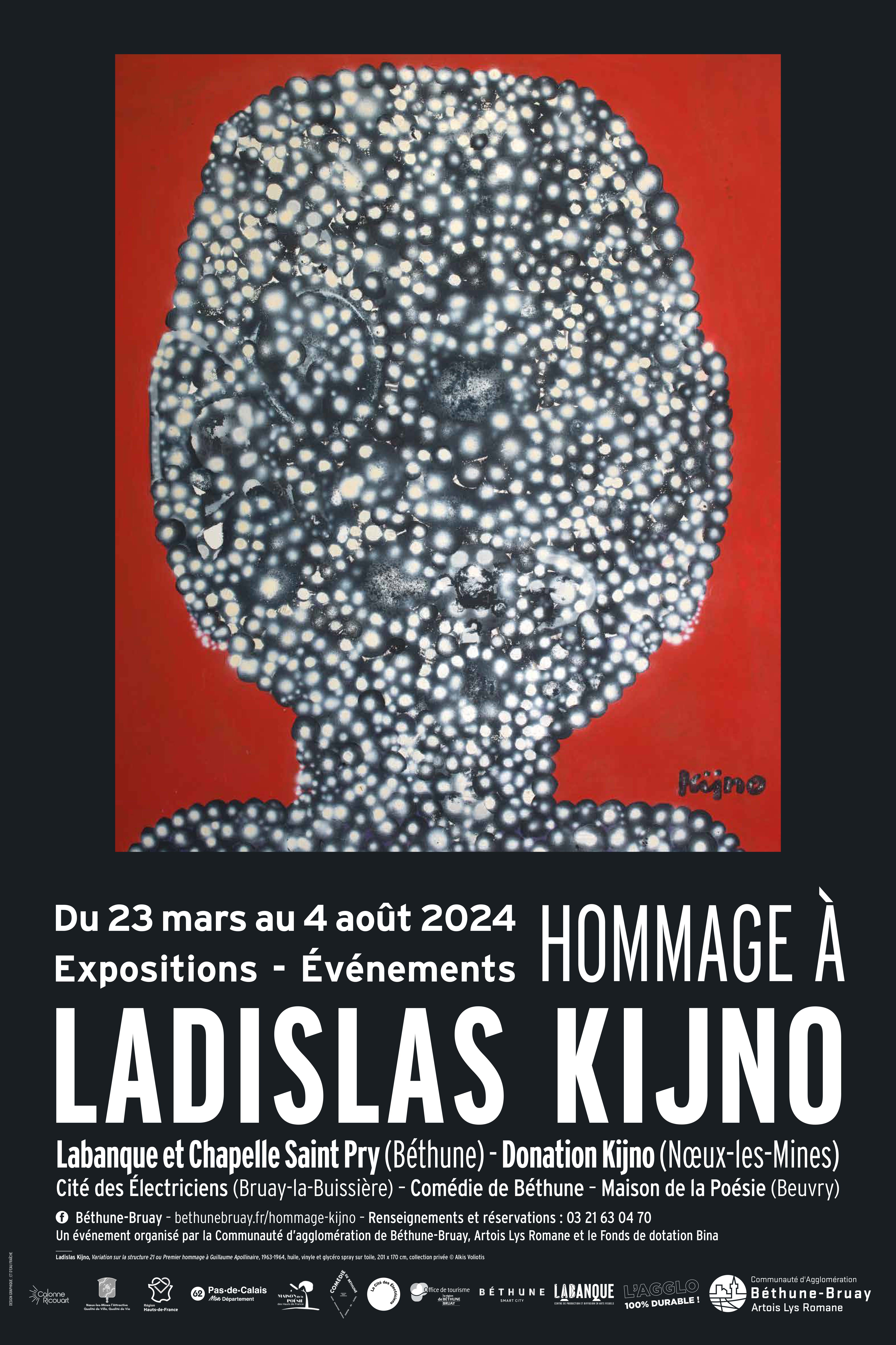 La salle des coffres de Labanque de Béthune sert d’écrin de manière métaphorique à la citation de Kijno : « Le peintre doit se faire scaphandrier pour descendre aux assises du monde et cosmonaute pour remonter jusque dans les étoiles. » On y découvre outre ses fameux galets peints, des empreintes de mains et des casques réalisés à la demande du commissaire-priseur et pilote automobile Hervé Poulain. Lors des 24 heures du Mans de 1975, Maître Poulain a fait peindre par Alexandre Calder sa première « Art-Car », une BMW 3.0 CSL et par son ami Kijno ses casques agrémentés de « signes premiers ». L’utilisation des galets chez Kijno renvoie à sa passion pour l’art préhistorique. Passionné d’anthropologie, l’artiste a passé sa vie à la recherche des origines de l’homme. Les galets peints apparaissent au paléolithique et on en trouve encore dans le quotidien des Indiens d’Amérique, des aborigènes d’Australie : stèles de pierre, dolmens contemporains, les âmes des morts résident en eux, ce sont des matérialisations des ancêtres.